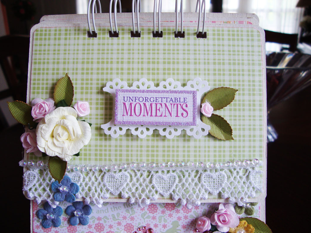 I bound the album with purple bows. The cover is decorated with Prima flowers centered with pink beads, a Tim Holtz plate, Recollections bling, yellowish roses that I got from the wedding section at Michael's. I just hand-wrote the title of the album.